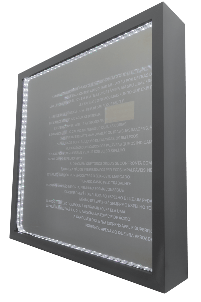Neste trabalho, o totem se assume como peça quase escultórica, o espelho se desfaz com o acender da luz interna da peça e o espectador deixa de ser imagem refletida e se torna receptor de uma série com dez frases que sintetizam o poder da imagem especular-fotográfica. Com o novo apagar das luzes, o espectador volta a ser imagem participante da obra com sua figura carimbada na superfície ativa do espelho. A cada novo ciclo se dá esse mistério inerente e imanente à própria natureza do espelho: só o próprio indivíduo pode ver a superfície “ativada”.